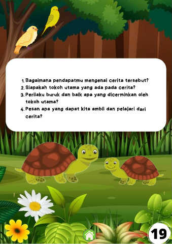 1. Bagaimana pendapatmu mengenai cerita tersebut? 2. Siapakah tokoh utama yang ada pada cerita? 3. Perilaku buruk dan baik apa yang dicerminkan oleh tokoh utama? 4. Pesan apa yang dapat kita ambil dan pelajari dari cerita? 19