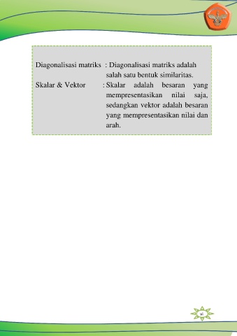 Diagonalisasi matriks : Diagonalisasi matriks adalah salah satu bentuk similaritas. Skalar & Vektor : Skalar adalah besaran yang mempresentasikan nilai saja, sedangkan vektor adalah besaran yang mempresentasikan nilai dan arah. vi
