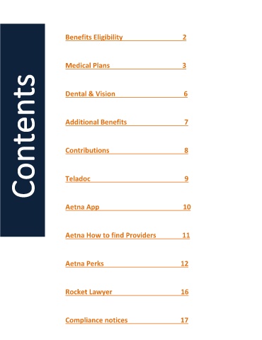Benefits Eligibility 2 Medical Plans 3 Dental & Vision 6 Additional Benefits 7 Contributions 8 Teladoc 9 Aetna App 10 Aetna How to find Providers 11 Aetna Perks 12 Rocket Lawyer 16 Compliance notices 17