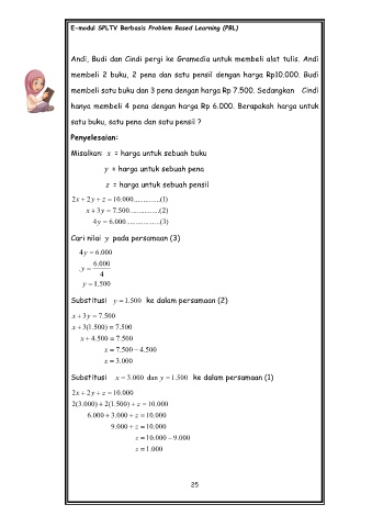 membeli satu buku dan 3 pena dengan harga Rp 7.500. Sedangkan Cindi