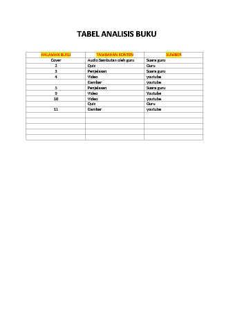 TABEL ANALISIS BUKU HALAMAN BUKU TAMBAHAN KONTEN SUMBER Cover Audio Sambutan oleh guru Suara guru 2 Quiz Guru 3 Penjelasan Suara guru 4 Video youtube Gambar youtube 5 Penjelasan Suara guru 9 Video Youtube 10 Video youtube Quiz Guru 11 Gambar youtube
