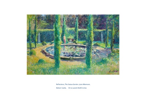 Reflections, The Statue Garden ,Late Afternoon, Belvoir Castle, Oil on panel 20x30 inches