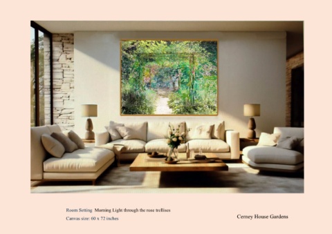 Room Setting Morning Light through the rose trellises Canvas size: 60 x 72 inches Cerney House Gardens