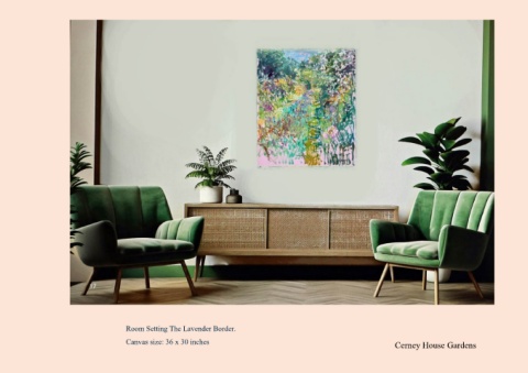 Room Setting The Lavender Border. Canvas size: 36 x 30 inches Cerney House Gardens