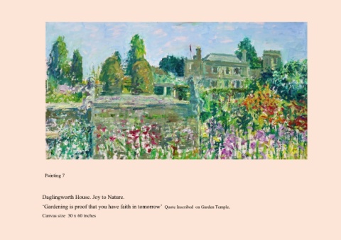 Painting 7 Daglingworth House. Joy to Nature. ‘Gardening is proof that you have faith in tomorrow’ Quote Inscribed on Garden Temple. Canvas size 30 x 60 inches