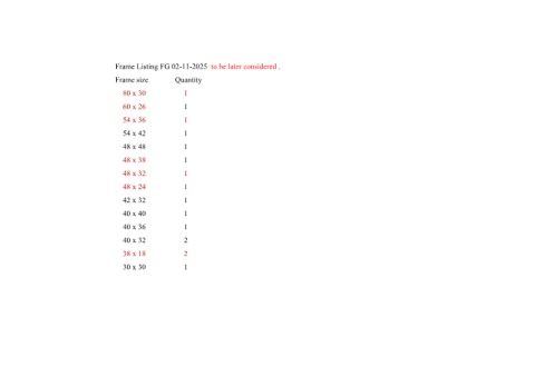 Frame Listing FG 02-11-2025 to be later considered . Frame size Quantity 80 x 30 1 60 x 26 1 54 x 36 1 54 x 42 1 48 x 48 1 48 x 38 1 48 x 32 1 48 x 24 1 42 x 32 1 40 x 40 1 40 x 36 1 40 x 32 2 38 x 18 2 30 x 30 1