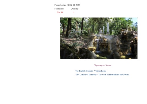 Frame Listing FG 02-11-2025 Frame size Quantity 72 x 36 1 Pilgrimage to Nature The English Gardens -Vatican Rome ‘The Garden of Harmony - The Craft of Humankind and Nature’