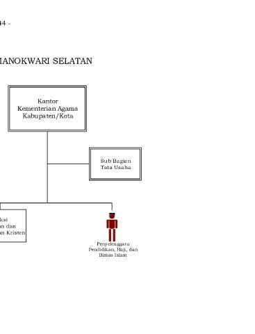 - 644 - BAGAN STRUKTUR ORGANISASI KANTOR KEMENTERIAN AGAMA KABUPATEN MANOKWARI SELATAN Kantor Kementerian Agama Kabupaten/Kota Sub Bagian Tata Usaha Seksi Urusan dan Pendidikan Kristen Penyelenggara Pendidikan, Haji, dan Bimas Islam