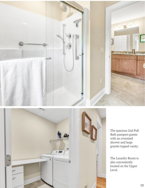 The spacious 2nd Full Bath pampers guests with an oversized shower and large granite topped vanity. The Laundry Room is also conveniently located on the Upper Level. 13