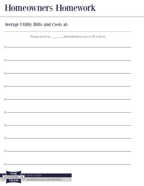 Homeowners Homework Average Utility Bills and Costs at: . Please email to @Vanderblue.com or fill in form . . . . . . . . . Seller’s Guide Vanderblue.com | 203.259.8326