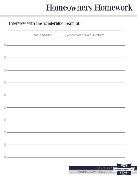 Homeowners Homework Interview with the Vanderblue Team at: . Please email to @Vanderblue.com or fill in form . . . . . . . . . Seller’s Guide Vanderblue.com | 203.259.8326