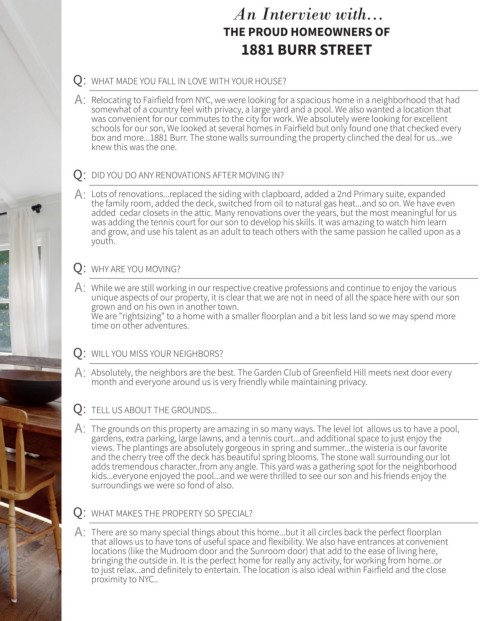 A: Relocating to Fairfield from NYC, we were looking for a spacious home in a neighborhood that had