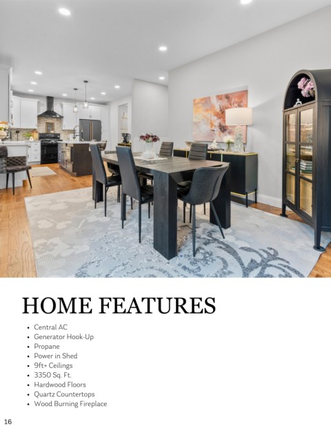 HOME FEATURES Central AC Generator Hook-Up Propane Power in Shed 9ft+ Ceilings 3350 Sq. Ft. Hardwood Floors Quartz Countertops Wood Burning Fireplace 16