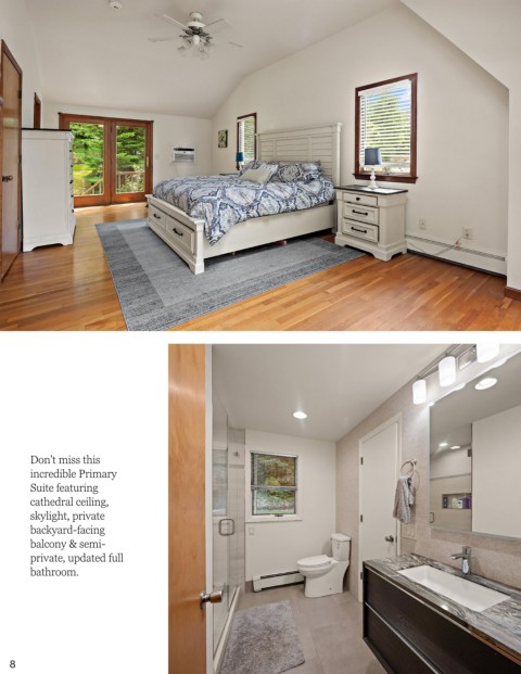 Don't miss this incredible Primary Suite featuring cathedral ceiling, skylight, private backyard-facing balcony & semi- private, updated full bathroom. 8