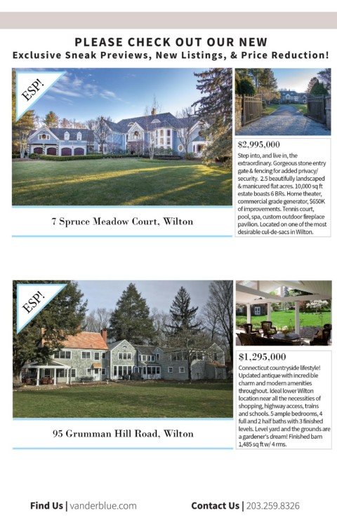 PLEASE CHECK OUT OUR NEW Exclusive Sneak Previews, New Listings, & Price Reduction! Find Us | vanderblue.com Contact Us | 203.259.8326