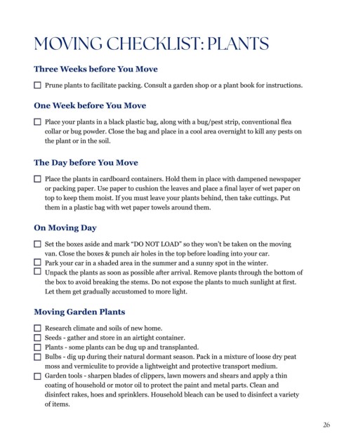 Prune plants to facilitate packing. Consult a garden shop or a plant book for instructions.