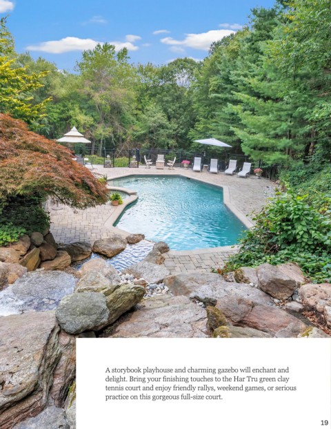 A storybook playhouse and charming gazebo will enchant and delight. Bring your finishing touches to the Har Tru green clay tennis court and enjoy friendly rallys, weekend games, or serious practice on this gorgeous full-size court. 19
