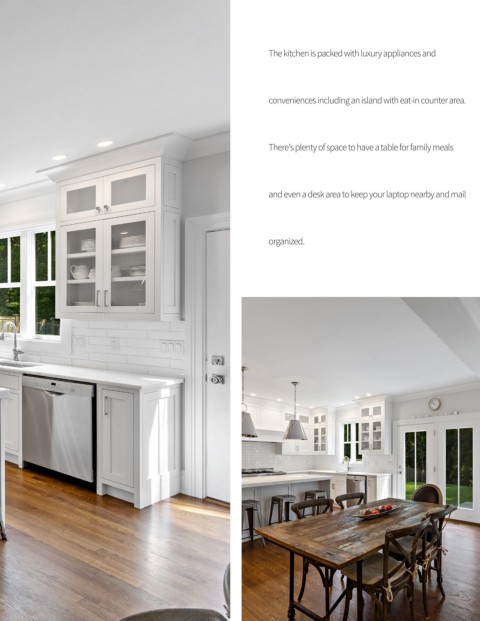 The kitchen is packed with luxury appliances and conveniences including an island with eat-in counter area. There's plenty of space to have a table for family meals and even a desk area to keep your laptop nearby and mail organized.