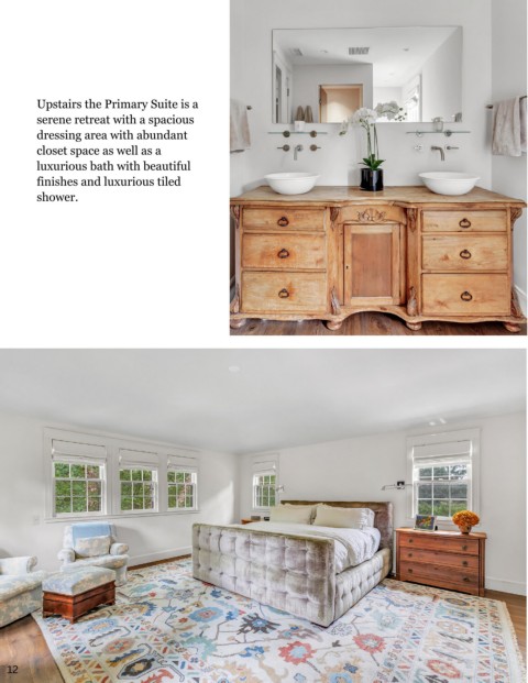 Upstairs the Primary Suite is a serene retreat with a spacious dressing area with abundant closet space as well as a luxurious bath with beautiful finishes and luxurious tiled shower. 12