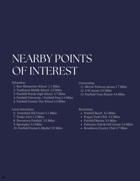 1. Burr Elementary School  1.1 Miles                       11. Merritt Parkway Access 1.7 Miles