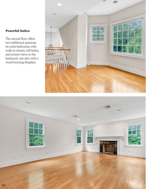 Peaceful Suites The second floor offers two additional spacious en-suite bedrooms with walk-in closets, full baths, and serene views to the backyard, one also with a wood burning fireplace. 20