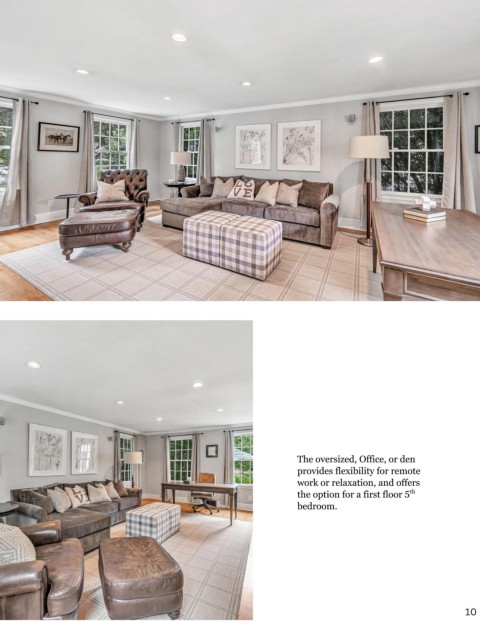 The oversized, Office, or den provides flexibility for remote work or relaxation, and offers the option for a first floor 5 th bedroom. 10
