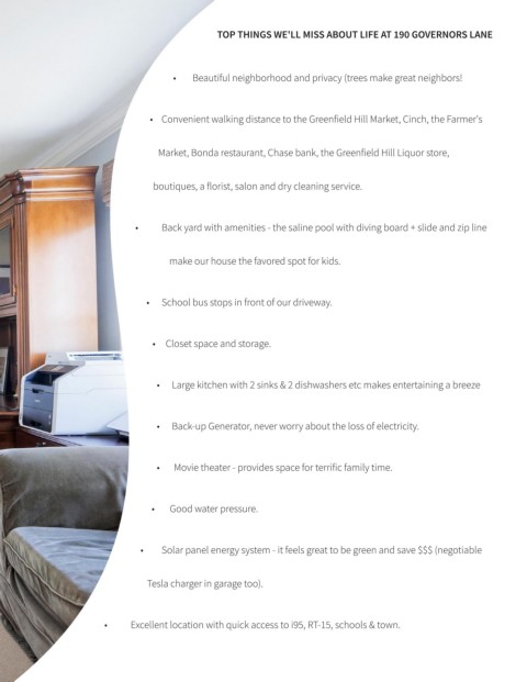 • Convenient walking distance to the Greenfield Hill Market, Cinch, the Farmer's