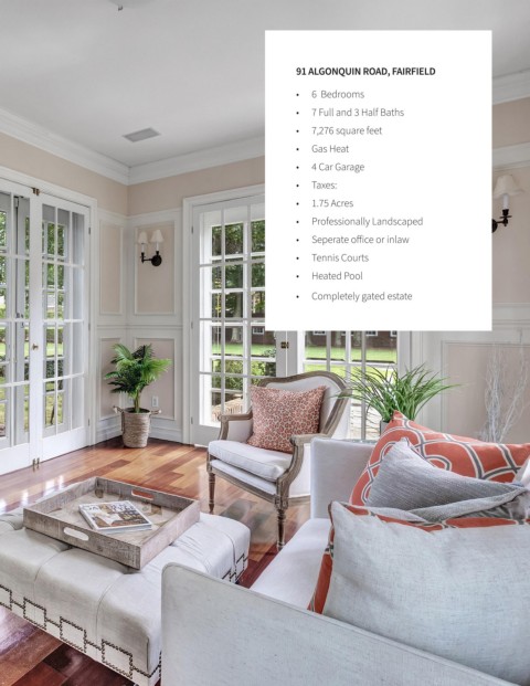91 ALGONQUIN ROAD, FAIRFIELD • 6 Bedrooms • 7 Full and 3 Half Baths • 7,276 square feet • Gas Heat • 4 Car Garage • Taxes: • 1.75 Acres • Professionally Landscaped • Seperate office or inlaw • Tennis Courts • Heated Pool • Completely gated estate