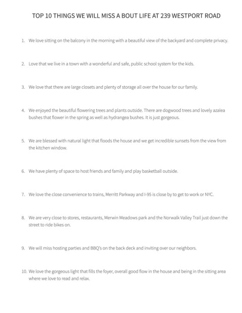 7. We love the close convenience to trains, Merritt Parkway and I-95 is close by to get to work or NYC.