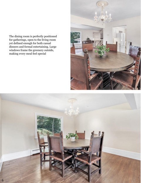 The dining room is perfectly positioned for gatherings, open to the living room yet defined enough for both casual dinners and formal entertaining. Large windows frame the greenery outside, making every meal feel special 6