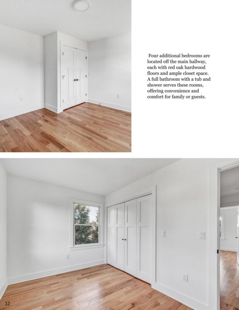 Four additional bedrooms are located off the main hallway, each with red oak hardwood floors and ample closet space. A full bathroom with a tub and shower serves these rooms, offering convenience and comfort for family or guests. 12