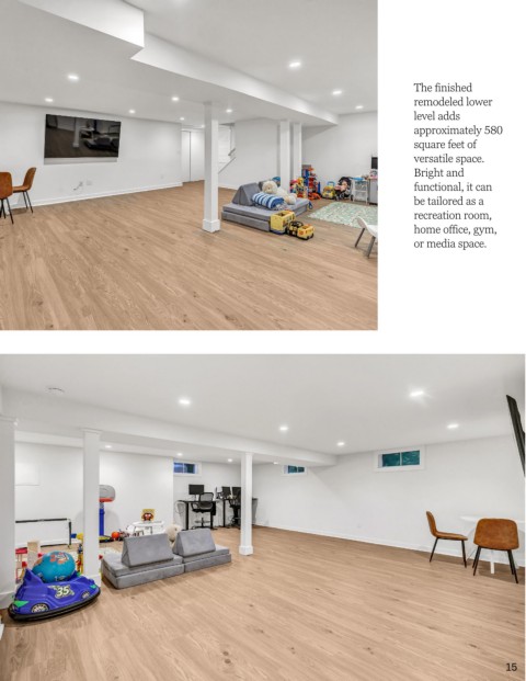 The finished remodeled lower level adds approximately 580 square feet of versatile space. Bright and functional, it can be tailored as a recreation room, home office, gym, or media space. 15