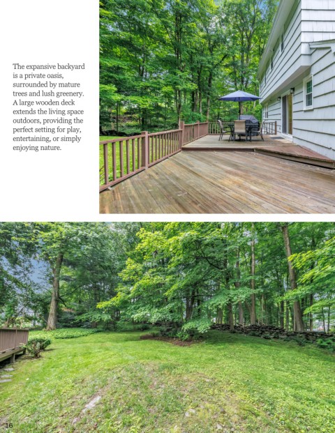 The expansive backyard is a private oasis, surrounded by mature trees and lush greenery. A large wooden deck extends the living space outdoors, providing the perfect setting for play, entertaining, or simply enjoying nature. 16