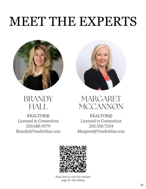 MEET THE EXPERTS BRANDY MARGARET HALL MCCANNON REALTOR® REALTOR® Licensed in Connecticut Licensed in Connecticut 203.685.9379 203.550.7254 Brandy@Vanderblue.com Margeret@Vanderblue.com Scan here to visit the website page for this listing 27