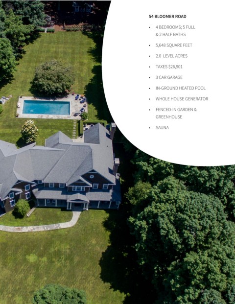 54 BLOOMER ROAD • 4 BEDROOMS; 5 FULL & 2 HALF BATHS • 5,648 SQUARE FEET • 2.0 LEVEL ACRES • TAXES $26,901 • 3 CAR GARAGE • IN-GROUND HEATED POOL • WHOLE HOUSE GENERATOR • FENCED-IN GARDEN & GREENHOUSE • SAUNA