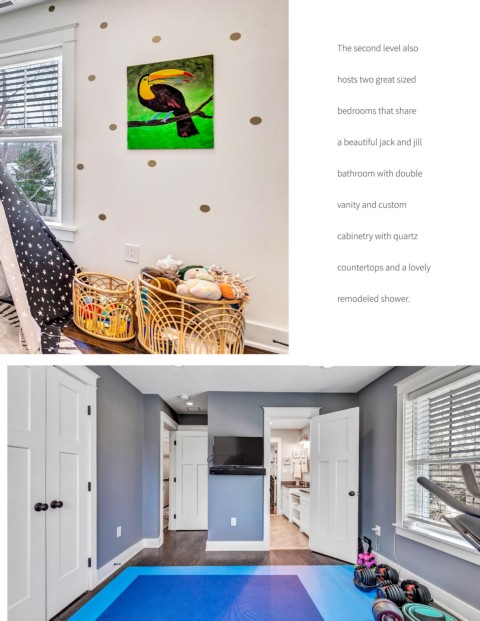 The second level also hosts two great sized bedrooms that share a beautiful jack and jill bathroom with double vanity and custom cabinetry with quartz countertops and a lovely remodeled shower.