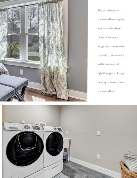The last bedroom on the second level is quite spacious with a large closet. It features a gorgeous private ensuite bath with custom vanity with tons of natural light throughout. A large laundry room completes the second level.