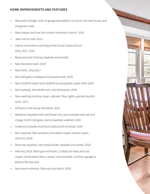 •   New cedar shingle roofs on garage and addition to house, the well-house, and