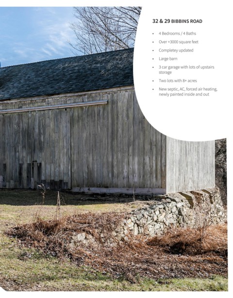 32 & 29 BIBBINS ROAD • 4 Bedrooms / 4 Baths • Over +3000 square feet • Completey updated • Large barn • 3 car garage with lots of upstairs storage • Two lots with 8+ acres • New septic, AC, forced air heating, newly painted inside and out