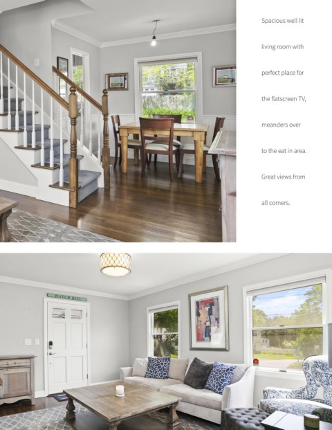 Spacious well lit living room with perfect place for the flatscreen TV, meanders over to the eat in area. Great views from all corners.
