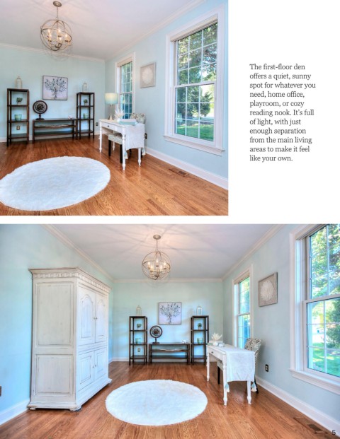 The first-floor den offers a quiet, sunny spot for whatever you need, home office, playroom, or cozy reading nook. It’s full of light, with just enough separation from the main living areas to make it feel like your own. 5