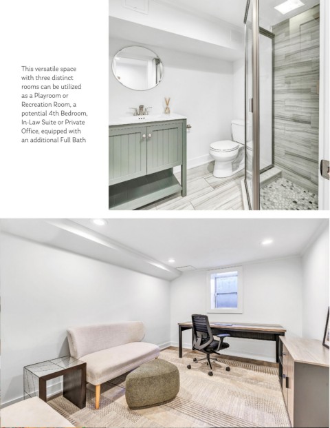This versatile space with three distinct rooms can be utilized as a Playroom or Recreation Room, a potential 4th Bedroom, In-Law Suite or Private Office, equipped with an additional Full Bath 12