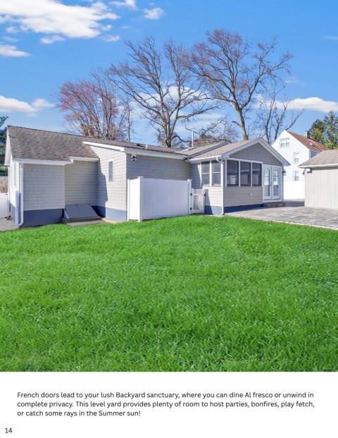 French doors lead to your lush Backyard sanctuary, where you can dine Al fresco or unwind in complete privacy. This level yard provides plenty of room to host parties, bonfires, play fetch, or catch some rays in the Summer sun! 14