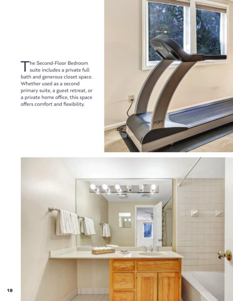 he Second-Floor Bedroom Tsuite includes a private full bath and generous closet space. Whether used as a second primary suite, a guest retreat, or a private home offi ce, this space offers comfort and fl exibility. 18