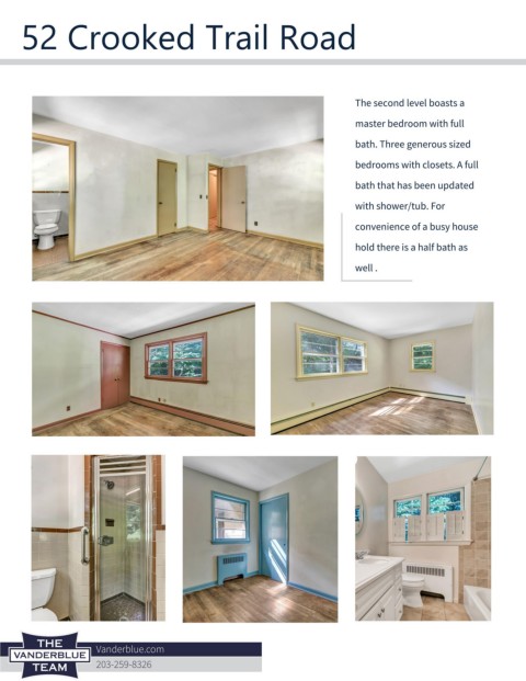 52 Crooked Trail Road The second level boasts a master bedroom with full bath. Three generous sized bedrooms with closets. A full bath that has been updated with shower/tub. For convenience of a busy house hold there is a half bath as well .
