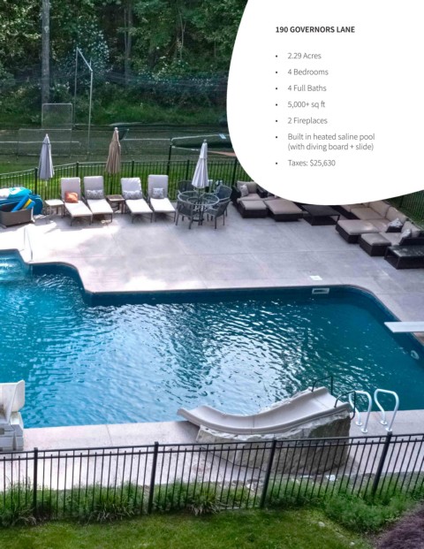 190 GOVERNORS LANE • 2.29 Acres • 4 Bedrooms • 4 Full Baths • 5,000+ sq ft • 2 Fireplaces • Built in heated saline pool (with diving board + slide) • Taxes: $25,630