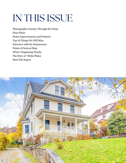 IN THIS ISSUE Photographic Journey Through the Home Floor Plans Home Improvements and Features Top 10 Things We Will Miss Interview with the Homeowner Points of Interest Map What’s Happening Nearby The Story of White Plains Meet The Expert 2