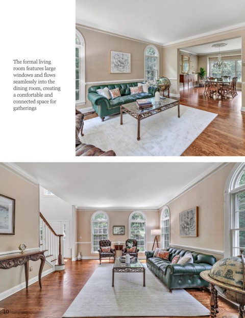 The formal living room features large windows and flows seamlessly into the dining room, creating a comfortable and connected space for gatherings 10