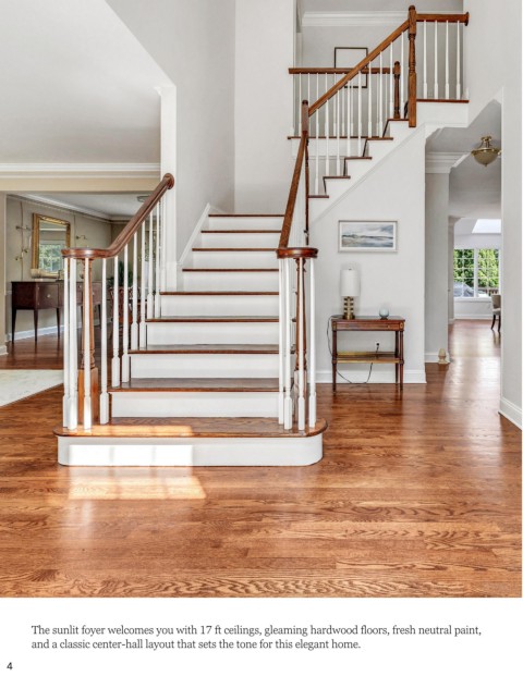The sunlit foyer welcomes you with 17 ft ceilings, gleaming hardwood floors, fresh neutral paint, and a classic center-hall layout that sets the tone for this elegant home. 4