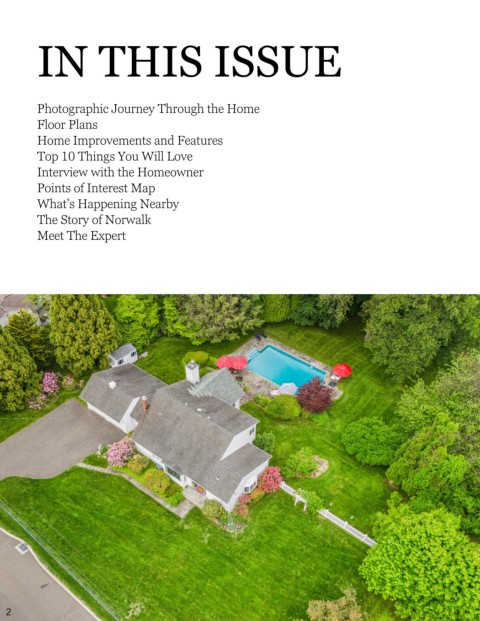 IN THIS ISSUE Photographic Journey Through the Home Floor Plans Home Improvements and Features Top 10 Things You Will Love Interview with the Homeowner Points of Interest Map What’s Happening Nearby The Story of Norwalk Meet The Expert 2
